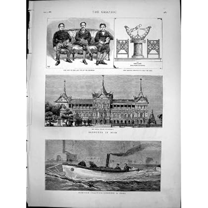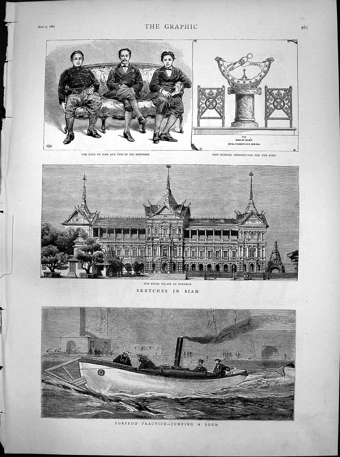 Copie antique de la pratique en mati?re 1881 de torpille du Roi Siam de Royal Palace Bangkok Antique Print of Royal Palace Bangkok King Siam Torpedo Practice 1881 An antique full page print from the The Graphic. Data if known in the title. Size of each print is approximately 12 x 16 inches (300 x 410 mm). All of these antique prints are the genuine article and not reproductions. Please check image carefully for any damaged such as foxing and tears. Note that some of these prints may be thin and easy to break. Keep in mind when purchasing.