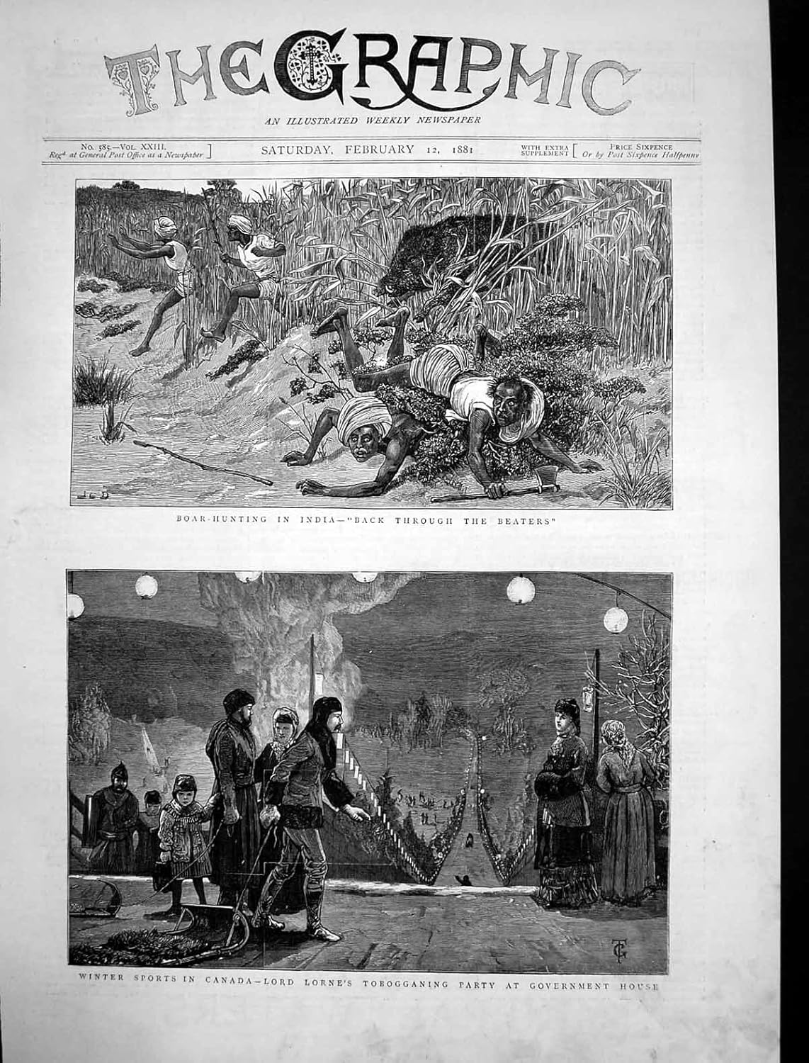 Verrat du Canada Tobogganing de Sports d'Hiver Chassant l'Inde 1881? Antique Print of Winter Sports Canada Tobogganing Boar Hunting India 1881 An antique half page print from the The Graphic. Date if known in the title. Size of each print is approximately 12 x 16 inches (300 x 400 mm). All of these antique prints are the genuine article and not reproductions. Please check image carefully for any damaged such as foxing and tears.